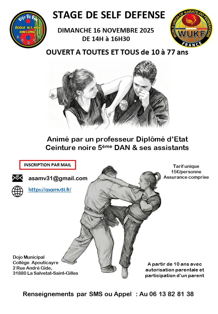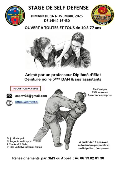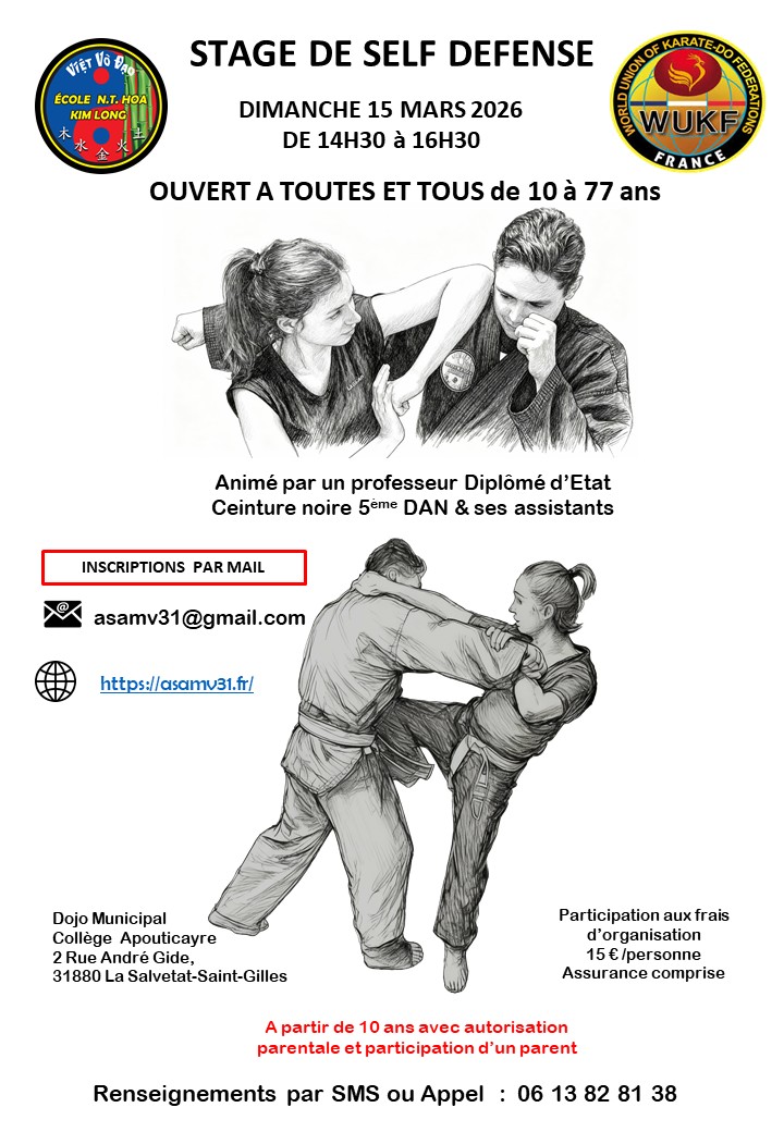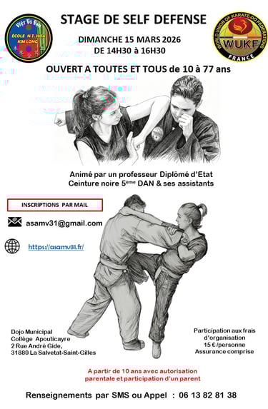 Nous proposons régulièrement des stages de self défense accessibles à toutes et à tous , dans une ambiance conviviale et familiale. Pour connaître les dates prévionnelles, merci de nous écrire via l'onglet "contact"